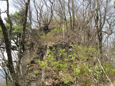 | 2万5千分の1図には東よけ岩のある1279m峰に「額々山」の山名が記されているが、「ガクガク石」は西に900mばかり行った、1227m独標峰の先にある。桑原先生は「1227m独標峰に額々山の山名を付すべきだと思うがどうしたものだろう」と、言われている。このガクガク石、上に乗ってもピクリとも動かない。額々山の西尾根にもう一つ〈よけ岩〉がある。ノブガ谷と二の谷の突き上げにあり、この岩は懸崖ではなく岩塔になって、上は素敵な展望台である。 | |