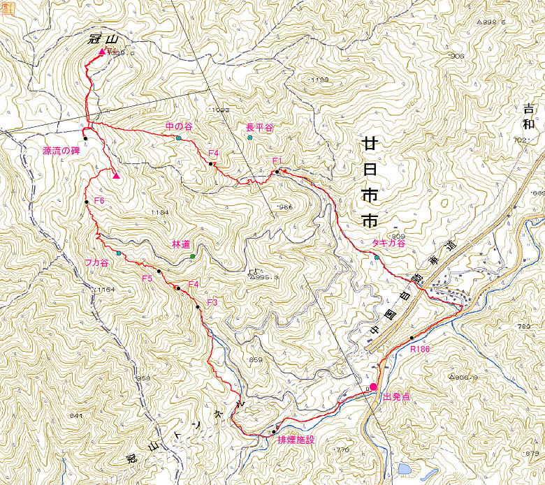 | 一軒家バス停(7:28/44)→村上嘉一氏顕彰碑(7:47)→冠山トンネル排煙施設(7:59)→フカ谷入渓(8:00)→木橋(8:04)→F3(8:47)→オオリュウズF4(8:52/9:28)→F5(9:35)→林道(10:06)→冠山南尾根小ピーク(10:36)→太田川源流碑(10:50)→冠山(11:13/42)→中の谷F4(12:39/44)→F1(13:07/16)→タキガ谷→中国自動車道高架下(17:07/12)→つり堀亭にしむら(14:19)→一軒屋バス停Ⓟ(14:29) |