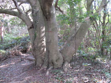 | 大寒波第2波の到来で、週末の西中国山地は吹雪、沿岸部も曇りの予報。沈殿を決め込んでいたが、明けて、窓を開けると風は冷たいが、好晴の空模様。と言うわけで、女房殿を誘って笠戸島の尻高山と高壷山を歩く。笠戸島最奥の集落、深浦地区の西の外れに広い駐車場とトイレがあり、そこが登山口。標識などは一切なく、誠にスッキリしており、トイレもよく手入れされている。まずは尻高山に向かう。駐車場前の護岸道を西に行くと、南西に転じて間もなくのところで、外野山林道が右(北)に分かれおり、これをたどる。外野山林道を7分(約400m)計り上ると、未舗装の林道が分かれている。尻高山への取付と勘違いして入り、引き返す始末。20分のタイムロスである。舗装された林道をひたすら北西に向かわないといけない。林道は安定型の産廃処分場のあたりから横手道となり、やがて未舗装になって、尻高山からカツネ崎へ下る北東尾根を乗り越して南に回り込んで下っている。尻高山登山道は、この尾根に付けられており、取付がU字カーブの突端にある。径は遊歩道のようにきれいに整備され、赤いテープもあって、通り過ぎてしまうような心配はまずない。登山口から取付まで、迷わなければ約25分というところか。広く切り開かれた尾根径を登って行くと、20分で尻高山の頂上。南東面が開けて、径の中央に三角点標柱(四等)がある。光り輝く瀬戸の海を眺めながら、至福の昼食。時折雪が舞うが、風はなく、寒くない。南西尾根を下ると、境界標柱のところ(外野山)で「象の肩」へ続く径が分かれている。これを捨てて南東に転じ、鞍部を上り返す。尾根径を20分近く行くと、火振岬の展望処があるが北側の眺めもなかなか良い。尾根径は一様に照葉樹に囲まれている。展望はないが寒風が遮られるので暖かい。鞍部(ガラン越)から30分で高壷山に到着した。二等三角点の標柱が埋められている。砲台山に向かうが、いい時間になってきたので軍事施設の遺構があるところから引き返す。笠戸島には、徳山要港防備のために造られた軍事施設(高角砲、探照燈、聴音機、兵舎、軍用道路等)の遺構があちこちに残っている。頂上稜線(北西)で巨樹に出会う。まわりの木々がみな若いので、高壷山の象徴として残されたのであろうか。シラカシと思うが自信はない。高壷山山頂から尻高山への下り15分(約700m)の所で、深浦(北)から大浦(南)への乗越し径が交差している。この径を行き、15分で登山口に降りた。 |