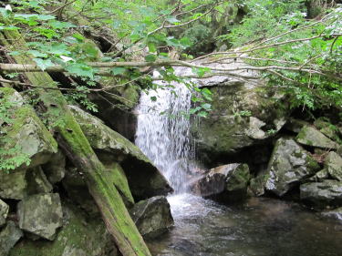 | 昨夏、坂根谷右俣遡行の帰りにウラオレ谷を下ったが、良い渓だったので遡ってみた。ウラオレ橋を右に見て風小屋林道を上がり、次の曲がり角にある山道を200mばかり入ったところで入渓した。露岩の上に大岩が乗っかり、その左端をF1の水流が落ちている。両岸に樹木がせまって薄暗く、しめ縄があってもよさそうな神秘的な雰囲気を漂わせている。ゴーロの谷がしばらく続いたあと、この谷の核心「三つ滝」が現れる。この谷で滝らしいのは、三つ滝だけで、ほかは滝といったら叱られそうな小滝、F2とF3だけである。そうは言っても、渓はそれになりに美しく、初心者の遡行には良いのではないか。三つ滝は柱状節理の大滝で、とても美しい。下段は左を、中段と上段はシャワークライミングで登る。予定では、ウラオレ谷右俣に移って十方山縦走路の鞍部に突き上げ、中三ツ倉から那須に還るつもりであったが、三つ滝の落口に立つころから雲行きが怪しくなってきたので、左俣をそのまま遡る。三つ滝より上は、まったく平凡な河原となる。1073m標高点を右上に見るあたりで左の尾根に取り付けば、15分で登山道に出た。時間が早いので十方山を目指すが、藤十郎を過ぎたあたりから本気で降りだした。雨の中を登る気にはなれず、那須に戻る。 |