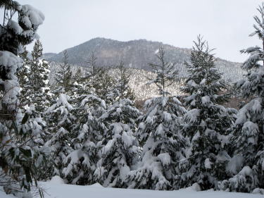 | 冠山の南尾根を登ってみたい、と思った。松ノ木峠から高圧線下地を北西にたどる。雪はスノーシューを履いても膝下まで潜り、おまけに気温が上がって湿雪である。フカ谷の木橋まで1時間を要する有様。山中に忽然と現れる巨大な排気塔に、いつもながら圧倒される。中の谷方面に上がる林道は、ゲートが閉まっていた。横を抜けさせてもらって、中に入る。林道は冠山トンネルの上を通ったあと、しばらく中国自動車道に沿うが、30分もすると北に転じて、中の谷を右下に見るようになる。美しく雪を纏った杉の樹林越しに、冠山東尾根の1129m峰が見えた。分岐を過ぎて、ヘアピンカーブのところを直登して上の道に上がるが、急な勾配は簡単ではなく、時間の短縮にはならなかった。さらに250mばかりで林道は終わる。中の谷に降りると、F1が雪を割って落ちていた。いよいよ南尾根に取り付くが、雪が深く、登るのは容易ではない。道半ばというのに、10時30分を過ぎている。このルートは雪がよく締まった時期以外無理、と断念する。リベンジを期して、一軒屋から国道186号線を松ノ木峠に還った。 |