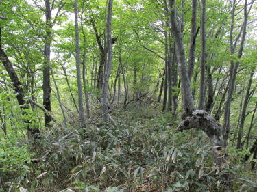 | 上市集会所に車を駐める。大山神社の参道が蔀山への登山道になっており、麓の鳥居から25分で蔀山城本丸があった山頂に達する。途中、大山神社にお参りする。立派な社であるが、傷みがひどい。二の丸、三の丸の跡は、かなり茂ってきている。後戻りして北東尾根に入り、毛無山に向かう。林道毛無俵原線に上がって右に少し行くと、取付がある。稜線に出て間もなくのところにパラグライダーのフライトポイントがある。眼下に毛無山牧場、彼方に草ノ城山を見る。毛無山の北稜に至ると、踏跡は濃いササに蔽われてくる。丈は高くないが、ペースは上がらない。ようやく、山頂のササ原に立つと、行く手に大毛無と猿政の山稜が指呼の間に続いている。大毛無の頂稜は、ブナ林に遮られて展望はない。ササが茂る林床に三角点は見当たらないが、あちこちに大きな氷の粒が溜まっている。雹である。久しく人の手が入った様子のない猿政山の西尾根で、クマさんに遭遇する。驚かせてゴメンナサイ。思ったほどの難儀もなく、猿政山の山頂広場に飛び出す。お弁当をたべて登山道を下れば、苦もなく毛無俵原線に降りる。県道110号線から国道432号線に出て、高野の美しい田園風景を愉しみながら、起点に還る。 | |