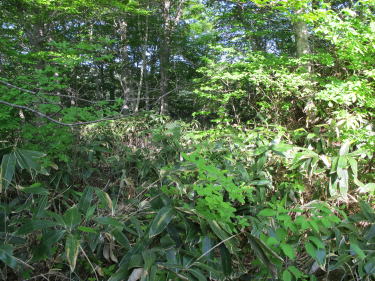 | 篠原集会所に車を駐める。里道を戻り、国道432号線に出る。大貫峠に向かうと、左の山裾では、24年度の供用を目指して松江道(三次JCT~吉田掛合IC)の建設が進められている。大貫峠を500mばかり下った、ヘアピンカーブのところから取り付く。谷の左岸に踏跡があるが、茂っているので尾根に上がる。尾根をひたすら北上すると、約40分で作業道に出て、さらに30分のササ漕ぎで縦走路に飛び出す。核心部は終わったようなもので、あとは快適な尾根歩きを愉しむばかりである。鯛ノ巣山の懸崖の上に立ち、昨日たどった猿政、大毛無の山嶺を感慨深く眺める。鯛ノ巣山からの眺望も素晴らしい。とりわけ、キラキラと輝く福原の田園風景には、感動して涙が出そうになる。毛無山への縦走路は美しいブナ森が続く。時おり南側が開けて、眼前に中央中国山地の峰々が広がる。毛無山展望台に至ると、南北180度の眺望が開け、三瓶山まではっきり見える。この際、気分が良いので、県境峠を上り返して、大万木山まで足を延ばす。帰りは北東尾根の鞍部から東の谷に下る。径は殆ど消失しているが、さほどの苦労もなく林道に降りて、山菜取りや草花鑑賞を愉しみながら起点に還る。 |