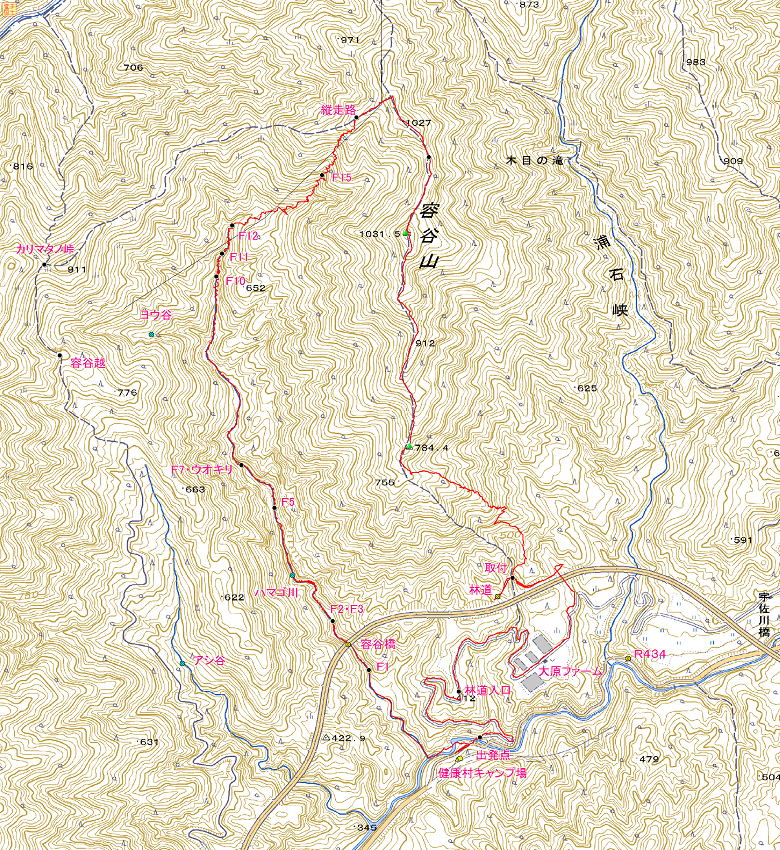 | 新樋尾橋(7:00/08)→容谷峡出合(7:20)→F1(7:37)→容谷橋(7:43)→F2・3(7:51)→ゴルジュ淵1(8:23)→ゴルジュ淵2(8:49)→F4(8:54)→F5・6(8:56/9:15)→ウオキリF7上(9:19)→F7落口(9:31)→F10(10:09/17)→F11(10:23)→F12(10:30)→二俣(10:52)→F15(1106)→縦走路(11:54)→木目の滝分岐(12:08)→容谷山(12:18/39)→784.4m峰(13:03)→林道(13:32)→三原ファーム(13:52)→林道入口(14:05)→出発点(14:19) |