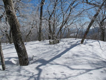 | 福田上の集会所に車を駐めて、林道粟倉木屋原線を上がる。路上の雪は凍みて潜らないが、大型車両(除雪車?)の轍で歩き難い。起点から福田頭取付までの、約4キロの道程に1時間20分を要す。谷あいの登山道は深い雪におおわれ、スノーシューを付けていても歩き難いこと甚だしい。ようやく昇龍の滝に達してみれば、その姿は龍尾だけを残して大半は白雲の中という有様である。稜線に上がると北側がクラストしており、クランポンが効いて快調に高度を上げる。ブナ樹林帯、兎舞台頭(うさぎぶたいのかしら)を過ぎて展望所に達すると、西面に素晴らしい眺望が開けた。その感慨も冷めやらぬ中、福田頭の山頂に立つ。そこは雪で造形された絶佳の展望台であった。東面には比婆山、道後山山塊が連なり、彼方に伯耆富士の白雪が見える。西面には猿政山から大万木山にかけての山嶺があり、遥か彼方に阿佐山山塊が望まれた。雪化粧をした山なみは美晴を背にして、いずこも美しい。しばし眺めやって、南に連なる井西山(いざいやま)への稜線を辿る。1mを超す雪に覆われた闊葉樹の山稜は明るく、樹間越しでも見通しは良い。稜線漫歩の心地で大波峠(おおはのたお)に至ると、峠越しの眺めの中に大山が際立っていた。峠から先の山稜は、主尾根が東の奥三角山(おくみすみやま)方面に向かい、途中で井西山と1192m峰の枝尾根が南に下っている。とりあえず、井西山へ上がる。雪のため、お椀を伏せたような見通しの良い山頂になっていて、大山を眺めながら昼食をとる。当初この枝尾根を下り、坊地峠(ぼうじだわ)若しくは観音滝に出ることを考えていたが、目の前に広がる1192m峰のなだらかな枝尾根に興味がわく。即、計画を変更して1192m峰の枝尾根に移ると、果たしてそこには平坦なブナ林の尾根が続いていた。が、素敵だったのは1156m峰までで、過ぎると林相はスギ、ヒノキの暗い針葉樹林に変わり、おまけに雪は腐って歩き難くなる。毎度のことながら、しまいの方はルート探しと林床の潅木に難儀しながら黒谷上集落に降りた。県道58号西城比和線を比和方面に向かう。集落は馬酔谷(あせびだに)で終わり、雪の残る道をさらに1キロばかり上って行くと、坊地峠に着いた。よく手入れされたヒノキ林が北へ緩やかに続いており、井西山からの下山をこちらにしなかったことが悔やまれる。比和町側で今櫛神社へ取り付く林道が分かれ、その約1.3キロ先で三つ子山城跡への林道が分かれている。小和田北地区まで下りると、ぼにばな(ヒゴタイ)が咲く慶雲寺がある。いずれも比和町三河内(みつがいち)の見所として大切に保存されているようだ。日を改めて訪れることにしよう、などと思案しながらポレポレと起点に還った。 |