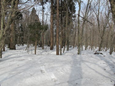 | 伴蔵原(冠高原)のR434旧道入口に車を駐める。北側の牧草地を縦断して、送電線管理道に取り付く。道は送電線に沿って北東に続き、フカ谷(タテ川)左岸の林道に出合っている。このところ3月下旬並みの気温が続いて、雪は多い所でも30cm程度。あまり潜らないが、重くて時おり踏み抜くので楽ではない。林道の出合に冠山トンネルの巨大な排煙施設があり、ここから冠山の南尾根(フカ谷とタキガ谷に挟まれた尾根)に取り付くつもりであったが、雪が少ないので断念。やむなく林道を辿る。少し雪が厚くなりだしたので、尾根に取り付く。縦横に張り巡らされた作業道に右往左往し、露出した除伐木に難儀しながら高度を上げて、ようやく移動通信(MC)用鉄塔のある995.3m峰に達した。県境尾根の登山道から眺めて、いつも気になっていたところだ。ここから尾根はしばらく北西に向かい、中の谷、フカ谷、ホン谷が突き上げたところから北に転じている。中の谷分岐まで上がると、林相は一変し、林床の雪も申し分のない量になる。右も左も闊葉樹の疎林で、広い雪稜とくれば、少々の急登も苦にならない。昨シーズンこの尾根を下って中の谷に降りたが、登るのも素敵だ。太田川源流碑の手前で、異形の老杉に出会う。あたりにはミズナラの巨樹も散見されて、冬ならではの景色が美しい。懸崖からの眺めを楽しみにして冠山山頂に達してみれば、春の陽気に彼方の山は霞んでいた。南面の日溜りで昼食をとっていると、感じのよい男性1人、女性2人の一行に寂地山への夏道を訪ねられる。食事を済ませて南尾根を下るが、ざっと教えたのが気になって夏道に出てみると一行の踏跡がない。もしやと思い、夏道を引き返す。程なく姿が見えて胸を撫で下ろし、「私もこれから寂地山に行くので、トレースを参考にしてください」などと、よけいなお節介を焼く。寂地山からの帰りに一行に出会い感謝されるが、読図トレーニングをしておられたとしたら、はた迷惑な親切だったのである。これからは気を付けるよう反省しながら、県境尾根の登山道を辿る。寺床あたりまではそれなりにスノーシューイングを楽しむが、だんだん雪が薄くなって、958m標高点のジャノウツ山あたりから雪のある斜面を伝い歩く有様。とうとう登山道入口のすぐ手前までスノーシューを付けたまま下った。起点に還ってみると、隣に貸切バスが駐車していた。福岡から来られた山の会の方々のもので、鬼ヶ城山へでも行かれたようだ。明日は汐原から冠山に登るそうである。良い天気でありますように。 |