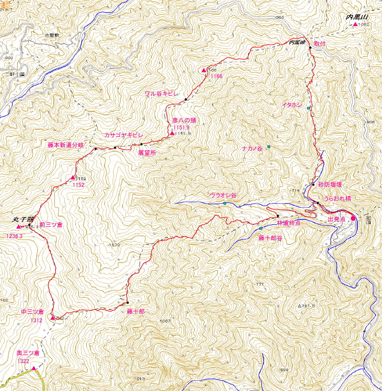| 那須ギャラリー前(8:28/34)→うらおれ橋(8:43)→(林道風小屋線)→林道終点(9:01/06)→小屋(9:11)→藤十郎(10:33/38)→中三ツ倉(11:13/20)→前三ツ倉(11:43)→丸子頭(11:46)→前三ツ倉(11:49/12:19)→藤本新道分岐(12:40)→カサゴヤキビレ(12:46)→展望所(13:00/05)→彦八の頭(13:11)→1166m峰(13:49/56)→内黒峠(14:20)→イタホシ取付(14:25)→砂防堰堤(15:03/07)→津波橋(15:12)→うらおれ橋(15:16)→起点(15:21) |