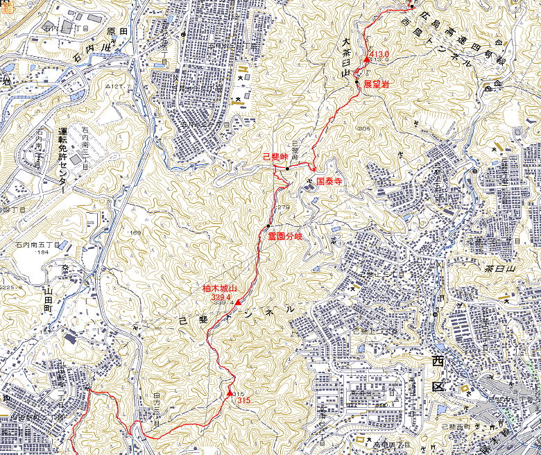 | 自宅(6:08)→八幡東登山口(7:03)→鈴ヶ峰西峰(7:39)→東峰(7:52)→道行地蔵(8:10)→鬼ヶ城山(8:25/29/)→柚木城山登山口(8:58)→柚木城山(9:37)→平和霊園分岐(9:53)→己斐峠(10:10)→展望岩(10:39)→大茶臼山(10:47)→畑峠(10:59)→宗箇山分岐(11:08)→丸山(11:27)→426m峰(11:43)→岩峰(11:54)→権現峠(12:02)→展望岩(12:22)→火山(12:29)→武田山(13:14/44)→吹通し(14:14)→カガラ山(14:24)→大町登山口(14:39)→大町駅(14:51) |