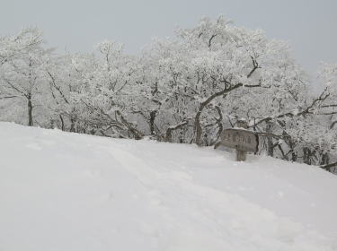 | 県民の森公園センターの駐車場に車を駐める。例年に比べ雪が多い。一息入れて、比婆山連山右回りを始める。前を単独の男性が夏道ルートに取り付いておられた。後に続くのは憚られるので、南に直登する。30分で展望園地(996m)に上がり、北面に広がる県境稜線を眺める。あいにく霧が出て、毛無、伊良谷、牛曳の頂は煙っていた。展望園地北側のトイレは、半ば雪に埋もれている。ササの尾根には下りのスノーシュートレースがあるが、歩幅が広く、右に左に蛇行しているので、なぞらず尾根筋を真っ直ぐ上がる。それでも気温が低く、雪が軽いので、難なく立烏帽子駐車場に達した。かの平坦地は、ここ数年見かけない積雪で、避難小屋などは埋没している。続く立烏帽子山への急登は、本コース唯一の難所で、頂上近くは鋭いスノーリッジになっていた。灌木に囲まれた山頂は、遮るもののない展望処と化しているが、残念なことに四周の景色は霧の彼方。そして、池ノ段に向かう吹きさらしの稜線は、霧に包まれて、ほとんどホワイトアウトの状態。池ノ段に至り、標識などは視認できるようになるが、あたりは真っ白で、下るルートをコンパスで確認する有様。林の中に入れば、風も止んで見通しもよくなるが、雪質は次第に重くなる。門栂(もんとが)は雪を纏って通り抜けることができず、外側を行く。御陵の祠も円丘もすっかり雪に埋もれていた。参拝して、神域に立ち入らないよう気を付けて、比婆山山頂に向かう。比婆山山頂からはスキーのトレースが現れたりして、雪面がにぎやかになる。烏帽子山の眺望も今日は今一つ。比婆山や毛無三山は見えるが、吾妻山方面には霧がわいている。風が強いので、早々に出雲峠へ下る。途中で雪山訓練中の大パーティーと行き交う。皆さん、大型ザックにツボ足で黙々と登っていられる。今夜は私がたどってきた雪稜のどこかで、野営されるのであろう。出雲峠で休むことなく、県境稜線を上り返す。毛無山へと続く踏跡を捨てて、桔梗ヶ丘に立ち寄る。そこは素敵な雪の展望処になっており、目の前に毛無山、その左手に仏山から鈩原、窓山への連なりを眺める。彼方に船通山が霞んで見えた。風のない縦走路まで下りて、遅い昼食。毛無山に達するころには、お日さまの出ている時間が長くなり、四周の景色が見通せた。烏帽子山の背後に吾妻山が、伊良谷山を右に置いて鈩原、窓山、船通山の連なりがはっきり見える。今日の天気では、大山まで観望することは叶わないが、四周の景色に堪能して、南東尾根を六ノ原に下る。夏道はよく踏み固められており、数組のパーティーと行き交う。六ノ原から容易に展望の山頂に立てるので、人気の雪山ルートになっているようだ。この際、踏跡は捨てて、ブナ疎林の尾根筋を忠実に下る。素敵なスノーシューイングを楽しみながら、26分で六ノ原休憩所の西側に降りた。 |