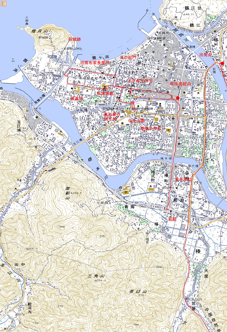 | 4/27 ☀ 新山口駅(10:06)⇒萩バスセンター(11:16)→唐樋札場跡(11:22)→中央公園(11:33)→萩博物館(12:13/13:30)→北の総門(13:56)→木戸孝允旧宅(14:10/19)→萩駅(14:50/15:08)⇒東萩駅(15:13)→松陰神社(15:45)→東光寺(16:24)→萩Royal Inteligent Hotel(16:55) 4/28 ☀/☁ 萩Royal Inteligent Hotel(4:36→椿大橋(4:59)→見返り橋(5:28)→道の駅「萩往還」(5:46)→悴坂駕籠建場跡(5:56)→明木橋(6:30)→五文蔵峠(7:25)→釿ノ切峠(7:52)→千持峠(8:25)→佐々並市御客屋跡(8:45)→首切れ地蔵(9:32)→国境の碑(10:26)→板堂峠(10:31)→一の坂御建場跡(10:57)→天花坂口(11:08)→一の坂ダム堰堤(11:24)→瑠璃光寺(11:44/55)→鰐石橋(12:36)→昼食(12:44/13:04)→氷上橋(13:28)→柊神社(13:59)→吉岡一味斉遭難碑(14:29)→郡境の碑(15:21)→剱神社(15:57)→舟橋(16:11)→まちの駅「うめテラス」(16:41)→三田尻御茶屋英雲荘(17:13/30)→防府駅(17:34) |