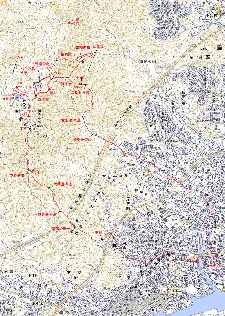 | 楽々園(6:47)→佐方2号トンネル(7:10)→取付(7:14)→荒蒔の滝(7:25)→平良参道分岐(7:36)→518.4m三角点(8:10)→極楽寺(8:27)→展望広場(8:34)→蛇の池(8:42)→四本樫分岐(8:59)→牛池堰堤(9:05)→四本樫(9:17)→障子岩分岐(9:28)→牛池林道終点(9:31)→椿乗越(9:40)→(椿尾根ルート)→白樫尾根ルート分岐(9:57)→障子岩(10:23)→障子岩分岐(10:29)→586.7m標高点(10:42)→二郎杉分岐(10:48)→堰堤・作業道(11:08)→極楽寺登山口(11:13)→坪井→起点(11:57) |