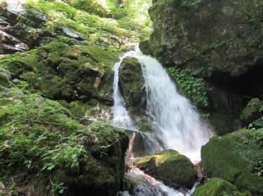 前回(7/30)のつむぎ谷遡行で、広高谷の下降を考えていたが、広高谷に至ってその余力は残っておらず、あえなく林道を辿った。で、今回改めて広高谷を歩いた。三葛には、吉賀町から県道42号吉賀匹見線経由で入ってみた。こちらも山道で長くはあるが、吉和を回るより走り易く、時間も変わらない。三葛へは断然このルートをお勧めする。三葛活動促進センターに車を置かせていただく。広高林道の避難所に駐めることも考えたが、何故か気後れした。歩きはじめて早々に、アブの大群に付き纏われる。この時期の風物とはいえ、まことに迷惑な昆虫たちだ。コウイ谷出合いに駐車禁止の表示があった。上にワサビ圃場があるのだろう。程なく右下の谷に透過型の砂防堰堤が見え、その下に露岩の滝がかかっており、これをF1とする。加名ヶ谷橋のすぐ上から入渓した。水量は少ない。小滝を三つ越えて約13分、3条の滝F2が現れる。この間、トポ情報「西中国山地の沢(三浦章著)」にある小滝F1を特定できない。水量が少ないのと、時を経て渓相が変わっているのかもしれない。F2は、左側の水流をシャワークライミングで直登する。