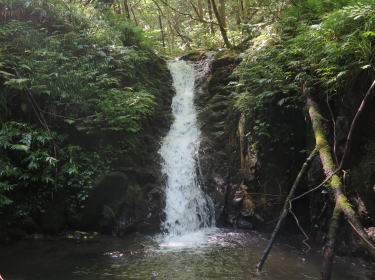 南尾根の登山道を辿り、七人小屋のクビレから山の谷に入る。300m計り下って、露岩滝F18に出合う。スラブ滝F17、露岩滝F16、露岩滝、二段滝、露岩滝F15、ナメ滝、斜滝、2条斜滝F14、斜滝F13と、中小の滝が連続したのち、長い河原歩きになる。この頃からポツリポツリ始まって、15分も下ったキジヤ床の手前で本降りになる。しばらく木陰に避難するが、止みそうにないので下降を再開。F13から900m計り下ったところで、ゴルジュになり2条の斜滝F12が現れた。焦げ茶色になった水が勢いを増して落ちている。C/S滝のF11が続いたあと、谷は次第に広まり、カツラやサワグルミの巨樹が立つ美しい渓畔林が現れる。が、これも束の間のことで、釜のあるF10から、この谷の核心部が始まる。すぐ下に大釜を受ける二段滝F9、二段滝F8と続き、鈴ガタキの下を逆S字に回り込むと、F7(2条)、F6(スラブとトユの2条)、小滝(2)、F5(釜有)に次々出合う。少し間を置いてF4(C/S釜有)、F3(釜有)が続き、すぐ下のF2(釜有)を過ぎたところで、匹見発電所の取水堰に出合う。この頃には雨も上がっていたが、もはやヘロヘロ。管理道にエスケープして匹見川合流口に出た。途中、高巻き道から谷を俯瞰すると、匹見川出合から少し入ったあたりに、大釜を受ける多段の大滝F1が見えた。出合から遡って様子を確かめる元気はなく、早々に匹見川右岸の道路へ退散。アブの大群に歓迎されながら西に辿り、県道307号線の崎田トンネル南出口に上がって、起点に還る。顧みれば、雨のため急いだので、曖昧なところも多い。次回は、匹見川出合から遡行して半四郎山に立ち、津合谷へ下ってみようか。