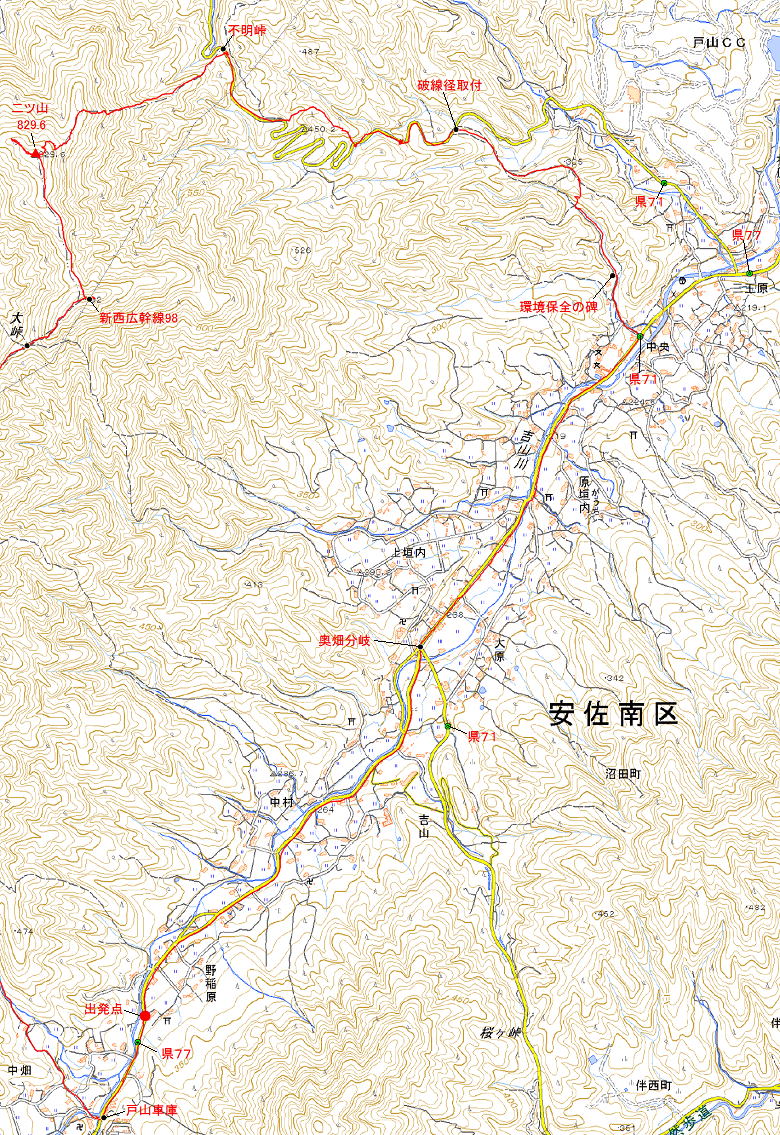 | 野稲原(7:00/23)→戸山車庫(7:29)→渓谷の滝(7:53)→まきおの滝(7:58)→五段返しの滝(8:02)→滝1(8:16)→滝2(8:21)→送電線鉄塔新西広幹線103(9:04)→大峠分岐(9:11)→四本杉分岐(9:20)→東郷山(9:27)→大峠分岐→新西広幹線101(10:02)→新西広幹線100(10:18)→鉄階段(10:32/37)→大峠(10:55)→新西広幹線98(11:09)→二ツ山(11:30)→不明峠(12:24)→昼食→破線径取付(13:18)→環境保全の碑(13:43)→県道71(13:48)→起点(14:36) |