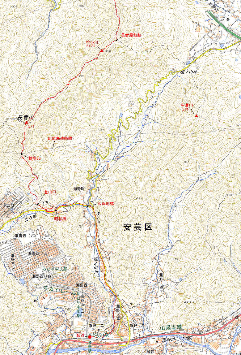 | JR瀬野駅(6:59)→長者山下立石登山口(7:41)→新広島連絡線鉄塔33(8:08)→長者山(8:30)→狩小川(9:11)→長者屋敷跡(9:16)→広島西条線鉄塔20(9:38)→湯坂峠(10:27)→高鉢山(11:13/21)→高鉢山北峰(11:27)→小野池分岐(11:57)→高鉢槍(12:05/32)→749.1m峰(12:58)→中三田分岐(13:29)→安駄山(13:48)→鳥井原分岐(14:00)→林道終点(14:33)→白木大橋(15:05)→JR上三田駅(15:14) |