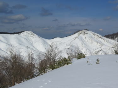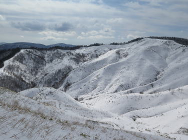 | この時分になると気温は上がり、遮るもののない雲月山稜の雪はすっかり重くなっている。が、身も心もそれに馴染んで、ゼーハー言いながらも一気に遠見所山(高倉山)に達することができた。南面草原のこの山の稜線はどこでも眺望絶佳。とりわけ、雪のある時期が素晴らしい。遠見所山(とおみどころやま)からは、北東彼方に大江高山や三瓶山、眼前に町章ヒノキの立つ千人立、その彼方に天狗高杉山塊、南西眼前に鉄穴流し(かんなながし)の仲の谷を抱いた雲月山稜などが眺められる。遠見所山から高山への渡りは見るからにきつそうだが、歩いてみるとさほどでもない。大休ミで一息入れて、難なく雲月山山頂に達す。西中国山地の冬景色を堪能して仲の谷へ下る。途中に堀割を渡るところがあるが、鉄穴流しに使われた集水溝の跡に違いない。859m標高点のある肩から、辿ってきた稜線を眺める。たおやかな白い山体が美しい。牧柵のある仲の谷林道の終点に降りて、林道を辿る。いいかげんうんざりしたころ県道114号今福芸北線に合流し、さらに20分、ようやく起点に還った。 | ||