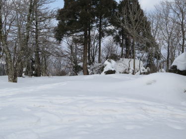 | 黒ダキ山山頂はすっかり雑木が育って、眺望はない。2、3mの積雪があればともかく、暖冬気味の昨今、それは無理というもの。逆に佛石は、周りの樹木に雪がないので、とてもよく見通せた。そうは言っても、黒ダキ山からの雪はそれなりで、難なく十方山南西尾根に達す。見慣れたブナの大枯木が雪折れしていた。途中でも、やたら雪折れが目についたが、1月24日~25日の西日本大寒波襲来のときのものだろうか。南西尾根に上がってしまえばこっちのもの。まだ先は長いが、とこでもロードの、雪のブナ尾根歩きの始まりである。雪は重いが、ワカンでもあまり潜らない。1142m峰北尾根を駆け下って、下山林道の峠に降りる。3年前は西方に五里の連なりが広がっていたが、樹木が育って、樹間越しに京ツカ山や1158m峰が見えるだけ。稜線に上り返して、ブナ森の雪尾根歩きを再開。毎度のことながら、夏だったらゼッタイ辿りたくない大ササ藪をさっさか歩けるのはとても愉快だ。が、快調ペースもバーのキビレまで。少々ボディーブローが効いてきて、ゼーハー言いながら、ようやく二本松に至る。 | ||
