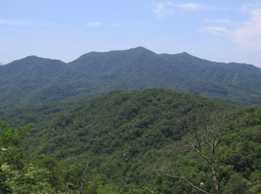 | 途中、蕎麦の実の形をした蕎麦ヶ岳の頂を樹木越しに見る。踏跡も微かに残って、難なく鞍部に降りる。北の谷に下ると、右岸にかつての山道が残っている。次第に途切れ途切れになって、ついには見失うが、大ヤブはなく容易。鞍部から35分で泉水原GC南側の里道に出た。右にとり、中国自動車道のアンダーパスを潜る。そこは、車が引っ切り無しに行き交うR376の荷卸峠。隙をついて走り渡り、東に130m行ったところから白石山に取り付いた。稜線に上がると、切り分け径が現れて気をよくするが、すぐにシダが茂り始める。320.9m三角点から340mばかりのところで、ヤブから解放される。尾根の西側が伐採植林地になって開け、真田ヶ岳や蕎麦ヶ岳連山が観望できた。が、快適な稜線漫歩は15分と続かない。さいわい、再開したヤブ尾根には微かに切り開きが残っている。大ヤブ漕ぎにならないことで、良しにしよう。徐々に高度を上げること40分、素敵な展望岩にめぐり会う。436m標高点の下にある大岩で、四周に遮るものがない。しばし、絶佳の眺望を楽しむ。 | ||