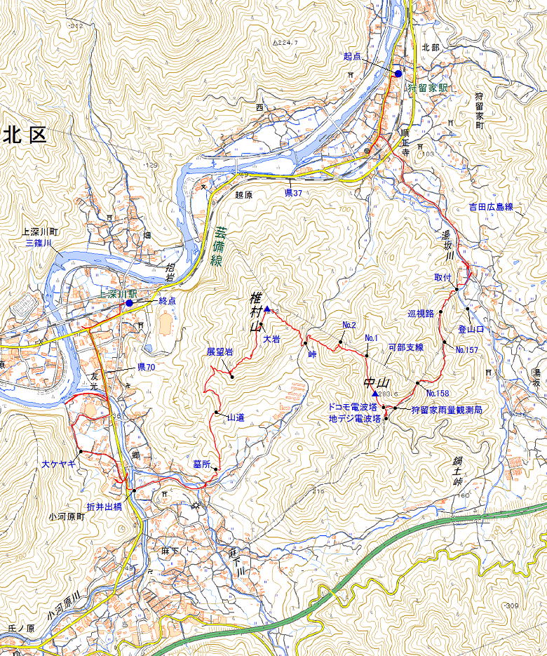 | 狩留家駅(7:48/52)→中山取付(8:20)→巡視路合流(8:30)→中電吉田広島線鉄塔157(8:35)→狩留家雨量観測局(8:54)→高陽デジタルテレビ放送所(8:58)→中山(9:04)→中電可部支線鉄塔1(9:09/17)→可部支線鉄塔2(9:24)→市道狩留家小河原線の峠(9:34)→椎村山(9:52)→展望岩(10:32)→墓所(11:02)→折井出橋(11:22)→大ケヤキ(11:32)→小河原川合流後の三篠川左岸土手(11:46/12:08)→上深川駅(12:26) |