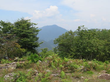 | すぐ、作業道のような遊歩道に出合う。ヘロヘロになって休憩広場まで上がり、大休み。真夏日の山行は応える。年だなぁ。重い腰を上げ、350mばかりの坂道を超スローペースで登る。17分を要して山頂に達した時は、頭がくらくらしていた。これって熱中症?木陰にへたり込んで、クールダウン。少し蘇って、二ヶ城山と高鉢山を観望。二段になった広い山頂は、山城の郭跡だそうで、大きな石が散乱している。満ち足りて、東尾根へ下山を開始する。 | ||