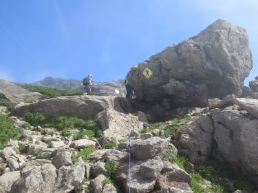 | 河原の坊コースが通行止めのため、来た道を戻る。雲の湧き立ちは時おりで、素敵な眺めを満喫しながら、ポレポレ下る。下りが苦手なカミさんは、そんなゆとりはないかもしれない。とりわけ、八合目から下の核心部は、一歩一歩慎重に一生懸命、である。天狗の滑り岩を降りると、御金蔵までは緩やかなガレ場道である。それでも足の運びが難しいようだ。ペースは上がらないが、ピョンピョン降りて、ひざを痛めるよりはるかに良い。右手に、河原の坊コースの御座走りの岩稜が間近に見える。今回たどれないのが、つくづく残念である。五合目を過ぎると、また急な下りになる。カミさん、大岩がゴロゴロしているハイマツ帯の道は、まことに歩きにくいようで、樹林帯に降りてようやくペースを取り戻す。山頂から2時間20分を要して、元気に登山口に帰り着く。少々時間はかかったが、とても素敵な山行でありました。もう一度姫神様に感謝して、起点を後にする。岳の峰南荘(ほうなんそう)で記念バッヂを購入し、ついでに、駐めた車の中で昼食をとる。 | ||
