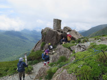 | 穏やかになったゴーロの岩場を飛び石伝いに上がっていくと、ほどなく稜線に出た。剣ヶ峰分岐を右(東)に分けて木道を行く。周りは御田植場(おたうえば)と呼ばれる高層湿原で、美晴の空のもとでヨサバシオガマ、ミヤマシオガマ、コイワカガミ、コバイケイソウ、ミヤマヤマブキショウマなどが咲き誇り、まるで天空の楽園を歩いているみたいだ。ほどなく門馬(かどま)分岐を右に分ける山頂基部に至る。岩塊斜面をひと登りして、早池峰山山頂に上がる。登山口からの所要時間は約2時間半、標準タイムだ。まずは早池峰神社奥宮にお参りしたあと、三角点そばに立って証拠写真を撮る。広い岩塊の山頂を周回して、観望を楽しむ。遠くは雲がわいて、岩手山や八幡平などを同定することできないが、剣ヶ峰や薬師岳など北上山地中央部の山なみを眺めやる。帰りに避難小屋の簡易トイレブースを使わせてもらう。高山植物監視員の方が、早池峰神社の由緒や河原の坊コースの状況(登山道崩落で通行止め)などを懇切に教えてくださる。下山を始めると呼び止められ、上質メモに登頂記念のスタンプを押して持ってこられる。感謝、感謝。 | ||