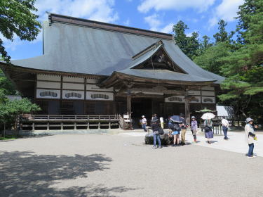 | あとの時間は、平泉観光。花巻ICから平泉前沢ICまで東北自動車道を利用し、中尊寺第一駐車場に14時15分に着く。荘厳な雰囲気に満たされた月見坂を上がる。順に弁慶堂、地蔵堂、薬師堂、本堂、峯薬師堂、鐘楼などにお参りする。そして讃衡蔵(さんこうぞう)で宝物を拝観したあと、金色堂へ。床下や屋根部分に890年余の時の流れを見る。そして、芭蕉が詠んだ光堂に思いを馳せた。最後に旧覆堂、釈迦堂をめぐって、毛越寺(もうつうじ)に向かう。中尊寺から約1.7㌔南で、つかの間の距離。本堂にお参りして、大泉が池をめぐる。平安時代の浄土庭園を今に伝えるというその景色は、素晴らしいの一語に尽きる。ゆっくり池のほとりを周回させていただいて、16時過ぎに隣接する宿に入った。 | ||