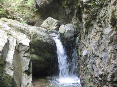 | 少し遡ると、ゴルジュになって小滝F7を前衛にした夫婦滝F8が見えてくる。F8は、水流の左側を登り、最後のトユ状部は水流を伝う。水が少ないので難しくない。さらにF9、F10、F11と小滝が連続したあと、曲水の滝と呼ばれる斜滝F12に出合う。いずれも簡単に直登できる。F12を越えて少し遡ると、谷は平凡な河原になり、橋が架かって遊歩道は左岸に移る。けっきょく滝らしいのは、F3、F5、F8だけのようだ。もはやこれまで、遊歩道を下って起点に還った。 | ||