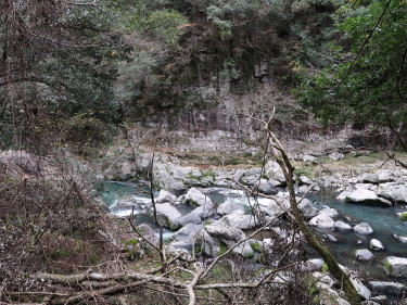 | 下の流れが千瀑洞口と呼ばれるところで、馬の背・碁石岩の景色とさほど変わらない。ただ、目の前に屹立する404m峰の懸崖はみごと。この先の左岸は岩壁が多くなり、黒部峡谷ばりの遊歩道や橋梁が整備されている。さっそく、東屋のすぐ先で桜橋と呼ばれる小さな橋を渡る。これより鈴ヶ茶屋までの橋梁などが補修工事のため、12月1日から来年の3月末まで通行止めになるらしい。 | ||