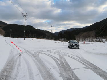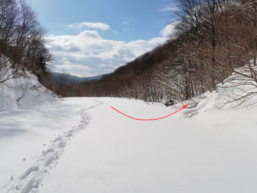 | かねて、持丸(もちまる)から道後山に登ってみようと思っていた。それに雪の道後山は歩いたことがない。行くなら今でしょ、と東城町小奴可の持丸地区へやってきた。3月末まで閉鎖されている広域農道(持丸豊栄線)の入口に車を駐める。北側の除雪された舗装里道をたどる。里道は250mばかり先の民家の背戸までで、まっさらな雪道(道後山林道)になる。積雪は50㎝超だが、よく凍みて難はない。ほどなく左に作業道が分かれて、かどに道後山と記された標柱を見る。道は持丸川左谷右岸に沿ってしばらく続く。900mばかり先で、左岸に渡る新道と右岸を行く旧道に分かれる。この際、旧道をたどってみる。すぐ、左の支谷に幾重にも重なった砂防堰堤群を見る。あたりは開けて、土石流扇状地を形成していた。うーむ。 | ||