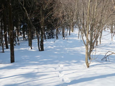 | どこでもロードの、なだらかな北東尾根を1300mばかりたどると、京ツカ山の山頂に至る。こちらもどこが山頂か分からないような、雑木がまばらに立つ雪の原である。行く手に五里山塊最高所の1168峰が横たわっている。地形図ではすぐなのに、とても遠く見える。 | ||