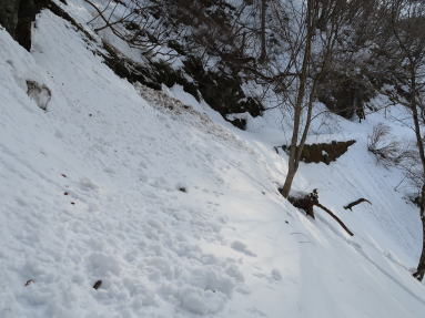 | あとは下ればよいわけだが、あっちこっちが雪崩で埋まって歩きにくいし、雪も腐って思いのほか潜る。十方林道入口にヨレヨレで還り、へたりこんでワカンを外す。起点はもうすぐ。やったー、という達成感はある。山の神様、今日もありがとうございました。 | ||