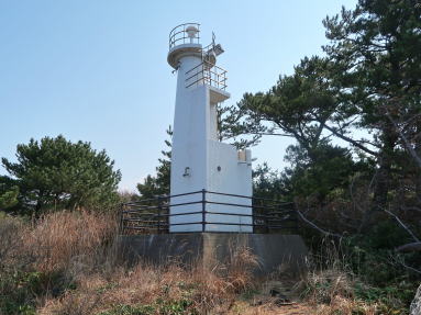 | 海岸遊歩道に入ると、手すりや路面などが再整備され、いっそう歩きやすくなっていた。碧く透き通った黒い溶岩流の海辺はおだやかで、広がる景色は例えようもなく美しい。箱メガネによる採介藻中の小舟、沖に浮かぶ大島や肥島の平べったい姿などなど。お決まりの採石場の跡やコウライタチバナ自生地をめぐり、虎ヶ崎灯台へ。 | ||
