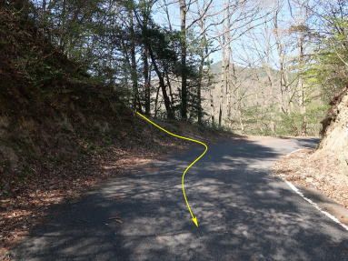 | 里道を南に向かうと、登山口の先に楽山神社がある。まだ新しい小さな社の横に和風レストラン様の建物が建っている。通りかかった人に聴けば、2015年3月に創建されたオートバイの神社だそうで、建物は人気蕎麦店「達磨雪花山房」の跡地に建てられた、休憩&宿泊施設とか。ビンテージバイクの展示や足湯もあるとのこと。僕はちょっと異邦人?早々に立ち去る。道なりに800mばかり下ったところから、2万5千分の1図に記された引地越えの破線径に入る。110m先で民家への取り付け道路と分かれ、右の草生した作業道(古道)に入る。多少ササが茂っているところもあるが、明瞭な道が峠越えしていた。 | ||