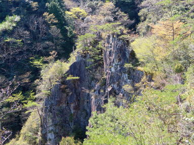 | 懸崖尾根の北西側(裏側)の支谷には、踏跡があった。難なく尾根の付根に上がると、横手道が左右に続いていた。ロープがないのでちょっと怖いが、懸崖尾根のピークまで行ってみる。そこには、白布の切れ端を残した玉付ポールが立っていた。かつては日の丸の旗がひるがえっていたのだろう。50mはありそうな垂壁岩稜をフリーで伝うのは、とても怖い。ここは登攀用具が必携だ。滝山の北尾根をちょっと見して、早々に退散。横手道を右(東)に取ってほどない、373峰の尾根筋に障子懸崖の展望所が切り開かれている。横手道はその尾根を乗り越して上原へと下っていく。やがて上槇橋北の民家の横を通って、県道301に出た。起点まであと1㌔余り。 | ||