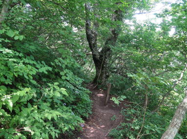 | しばらく素敵な草原の道行きが続く。左に子三瓶、孫三瓶のたおやかな頂稜、眼下に広い西の原や浮布池(うきぬのいけ)が広がる、稜線漫歩。出会う草花は、キンポウゲ、イヨフウロ、ウツボグサ、シモツケソウ、カワラナデシコ、キンラン、アカモノ、ホタルブクロなどなど。道はガレて歩き難いけれど、まことに爽快だ。標高900mあたりまで高度を下げると、樹林帯に入る。ジッグザッグに下ったあと、南横手の道になる。姫逃池分岐のある中国自然歩道までの間、約40分。樹林帯に入る前、足下に西の原を見ていたせいか、この40分がやたら長く感じた。 | ||