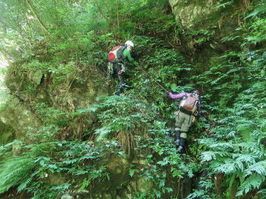 | 瀬戸滝の巻き径を過ぎたところで、さっそく露岩斜めのF1に出会う。懸崖との際を水が流れ下っている。登るのは簡単。上の3mC/S滝F2は、僕には難敵。中ほどに打たれたリングボルトにアブミを掛け、落口に引っかかった流木に足をかけて這い上がる。カチこさんはというと、リングボルトにヌンチャクで足場をつくって、いとも簡単に越えてしまった。あの様子なら、ヌンチャクの足場がなくても十分登れたと思う。 | ||