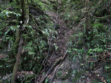 | 鹿野さんは左岸ルンゼを登っているが、滝全体を俯瞰しようと、もう少し手前の斜面に取り付いた。落口の高度まで上がってF12の様子を窺う。両岸が切り立って滝の直登は見るからに難しそう。F11落口にトラバースして進退窮まったときのことを考えると、足が向かない。で、軟弱ではあるが、大高巻きと決す。ゼーハー木登り約15分、インクライン軌道跡と思われる道に飛び出した。 | ||