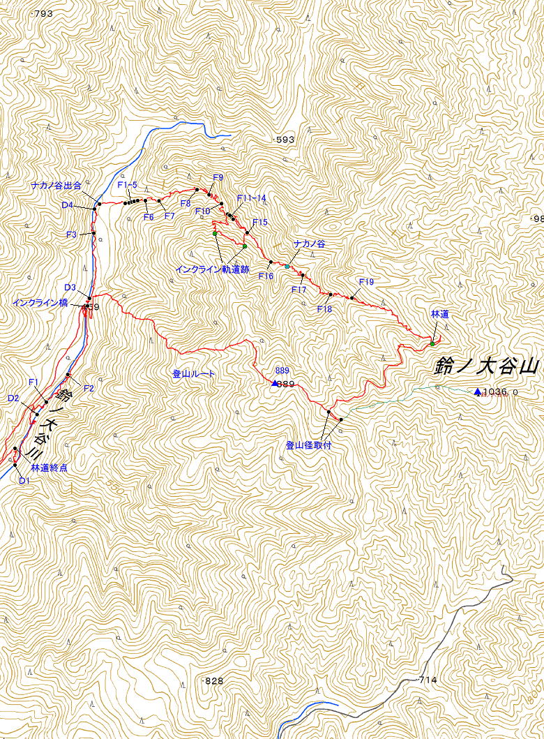 | 鈴ノ大谷橋西詰(7:16/31)→林道終点(7:45)→入渓(7:48)→D2(7:59)→F1(8:03)→F2(8:15)→D3(8:31)→F3(8:38)→D4(8:45)→ナカノ谷出合(8:47)→F1(8:50)→F2(8:51)→F3(8:52)→F4(8:54)→F5(8:55)→F6(8:57)→F7(9:04)→F8(9:15)→F9(9:21)→F10(9:30)→F11(9:34)→インクライン軌道跡(9:53/58)→F14落口(10:08/12)→F14直下&F13落口(10:16/21)→F14落口(10:27)→F15(10:31)→F16(10:41)→F17(10:58)→F18(11:06/14)→F19(11:20)→林道(11:53)→登山径取付(12:11/15)→889峰(12:25)→インクライン橋下(13:02/13)→起点(13:38) |