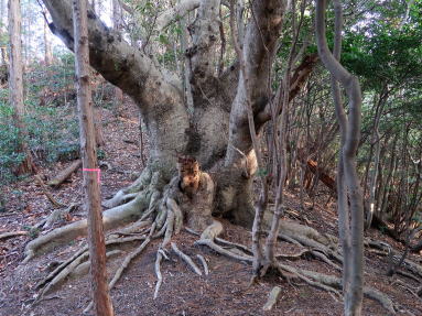 | 北尾根の径はよく踏まれており、楽ちん。ひと下りすると、異形の老タブに出会う。樹幹に手を添えて、今日の山行を感謝。さらにひと下りで、林道の峠に降りる。堀切道が入野(いりの)と石原を繋いでいる。向かいの尾根に径は続いて、ピークを乗り越すと、今度は作業道の峠に降りた。あたりのヒノキ林には、竹が蔓延っている。向かいのピークに上がり、尾根筋の径をたどること約650m、光市と岩国市の境界尾根に合流した。はじめ女竹が茂って、ちょっこし西面の作業道にエスケープしたけど、概ね尾根筋をキープ。境界尾根のピークには、柳井火力連絡線の鉄塔36が建っているが、見晴しはない。市境尾根は、鉄塔37が建つ北西の302.8峰南頂稜に向かい、そのあと西に転じて周南広域農道の峠へ下っていく。鉄塔巡視路はというと、302.8峰南西尾根を巻いて鉄塔37に立ち寄ったのち、西側の鞍部から北西に向かう送電線に沿っているようだ。鉄塔37の見晴しはよく、南から東にかけて石城山、姥河内山、北西に豊後峰、天登山、などが眺められる。 | ||