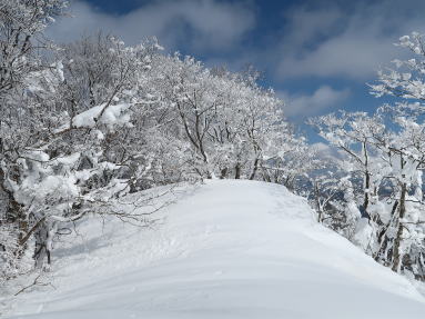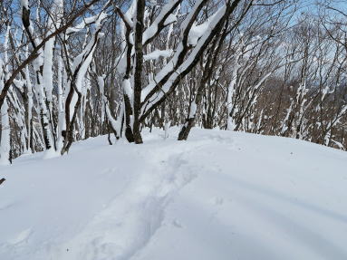 | 東沼ヶ原の夏道をたどるのは、この時期なかなか難しく、左に右に蛇行してしまう。思いのほか時間がかかり、寂地山ピストンは断念。せめて後冠山まではと、ラッセル歩行を続けるが、もはやタイムオーバー。1282峰との鞍部から、樹林越しに頂稜を見透かしてUターンする。帰りは自分の踏跡をたどるので、まるで楽ちん。土滝山から東に、新たな踏跡が下っていた。先の単独女性のものと思われ、ちょっとたどってみるが、見当たらないので引返す。迷走されたのだとしても、間なしに自分の踏跡に出合っているはずだから、余計なお世話は止めにして、雪のブナ森を愉しくスノーシューイング。展望所で一息入れたあと、松ノ木峠へ駆け駆け下った。所要時間、1時間10分。うーむ、先週より早いが、以前は1時間かからなかったのに。 | ||