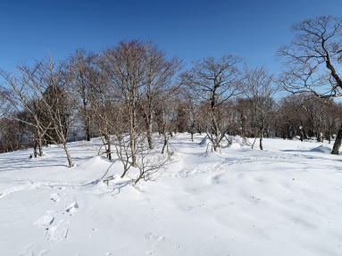 | ナラガシワが群生する広い雪の頂稜を、北にたどる。てっぺん標識は、芸北国際スキー場おおひらエクスプレスリフト上駅の西にあるが、平坦な雪の原にその位置を特定するのは難しい。地デジ中継局が建つ北尾根の肩より、北西にブナ尾根を下る。標高1070mあたりは北面が開け、柏原山から土橋大平山にかけての県境稜線を眺めることができる。あのヤブ尾根も、今なら簡単にたどれそう。地デジ局から20分あまりで、土草峠に降りる。 | ||