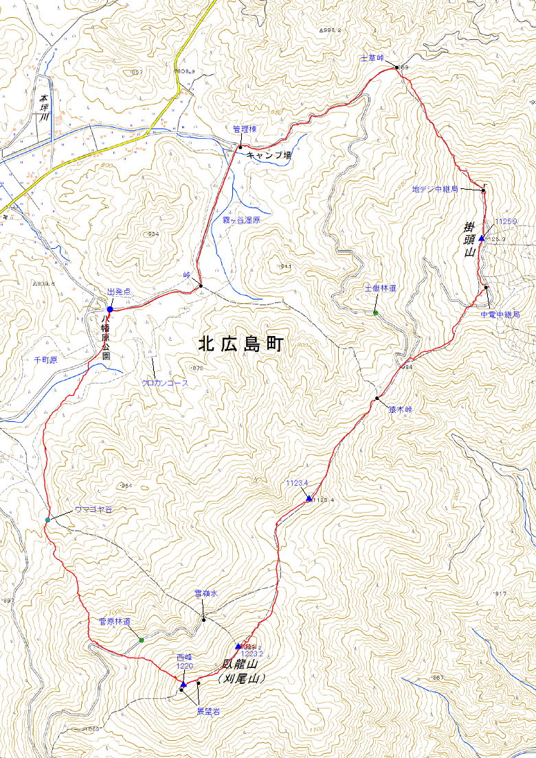 | 芸北高原の自然館(7:34/49)→千町原→ウマゴヤ谷渡渉(8:19)→菅原林道(8:46)→苅尾山西峰(9:10/21)→苅尾山(9:28)→1123.4峰(9:58)→猿木峠(10:14)→大嶽林道(984m標高点)(10:20)→中電中継局(10:48)→掛津山(10:56)→地デジ中継局(11:04/14)→土草峠(11:37)→二川キャンプ場管理棟(11:54)→町道民部線の峠(霧ヶ谷湿原入口)(12:12)→起点(12:21) |