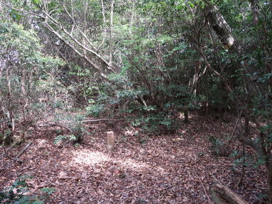 | 天狗岩山との鞍部からは、北側の谷筋に入り385峰との鞍部に上がる。右(東)にひと上りすれば、天狗岩山の山頂。雑木に囲まれた小さな平地に境界石柱が立つだけの山頂で、あたりに呼名のような大岩は見あたらない。おだやかなマツ雑木林の稜線を東に約10分、黒河内山に到着。雑木に囲まれた明るい平地の西端に二等三角点が立っている。点名は荒神山。南面が開け、火ノ山や大海山を眺めることができる。地形図にある南の破線径は、あるようには見えない。突っ込めば踏跡ぐらいあるのかもしれないが、この際、無難な東尾根の道を選ぶ。 | ||