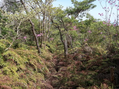 | 馬頭観音のすぐ上の鞍部を右にひと上りすると、狐ヶ峰の南尾根になって、陶峠への尾根道を右(東)に分ける。ここは、尾根の変則十文字分岐だ。狐ヶ峰南尾根の道を上る。灌木や低松が途切れるところがあり、眼下に広がる街並みや魚切山天狗岩山稜線の景色に親しむ。道にはシダが茂っているが、ミツバツツジが咲き誇ってそれを帳消しにしてくれる。狐ヶ峰の山頂は、雑木に囲まれた小さな平地で、背伸びしても山口市街を垣間見るのがやっと。 | ||