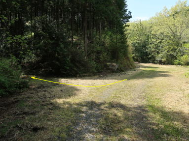 | なんだかこのまま敗退するのも悔しくなって、少し下ったところにある別の支尾根径に再チャレンジ。が、高度を上げるにつれてヤブはひどくなり、もう一つ南の支尾根に渡って、ようやく主脈に上がるという有様。そこにシダはなく、ひと上りで深山のてっぺんに達した。ヒノキと雑木の林で、平地もない。踏跡が東の尾根に下っている。南尾根に少し下ってみるが、茂っているので引返す。もはや田尻山まで行く元気はなく、東尾根の踏跡をたどる。10分ほどで作業道に降りて、ほどなく林道広場に出た。 | ||