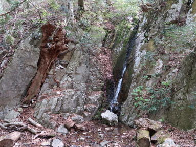 | 渓水はさわやかに流れ下り、道のへりにはネコノメソウ、タチツボスミレ、サンインシロカネソウなどが、可憐に咲いている。やがて鳥上滝。左手衝立岩の岩溝を、水が静かに流れ落ちている。その左の岩間にくいこんで残る枯木は、いつからああしているんだろう。 | ||