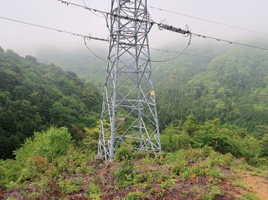 | ほどなく、左に山道が分かれ、入口に高倉山、願成寺跡、元荒神社跡と書かれた立札が立っている。道は鉄塔巡視路で、要所に樹脂製階段や簡易鉄橋などが整備されて、歩き易い。10分も上ると、山口幹線鉄塔107が見えはじめて、明るく開ける。北西に黒川の街並みが霞み、東に立ち上がる高倉山の主稜線は霧に包まれている。 | ||