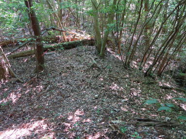 | 左(北)に下ってほどなく、主脈鞍部の左手で、馬頭観音石仏に出会う。乗越鞍部になっているところを見ると、ここは藤ヶ本(ふじがもと)と河井を結ぶ古道であったに違いない。馬頭観音の少し先で、山道が左の谷に分岐する。右の横手林道を選んで約800m、ふたたび分岐する。右の道は先で上河井の里道に合流する、と思う。左の草生した道に入る。 | ||