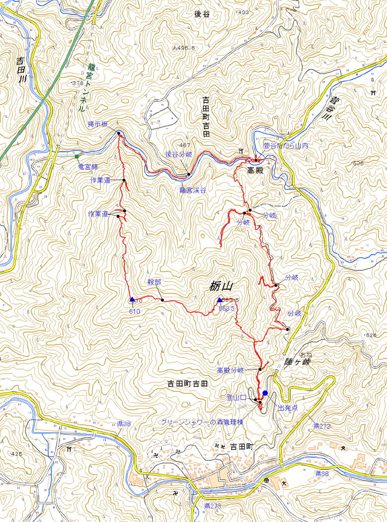 | 吉田グリーンシャワーの森(8:00/10)→栃山登山口(8:14)→菅谷高殿分岐(8:27)→栃山(8:46/54)→西尾根鞍部(9:28)→610峰(9:37)→610峰北尾根→市道竜宮線(10:37)→後谷分岐(10:50→菅谷たたら山内(10:59/11:10)→栃山東面の横手道→栃山登山道(12:34)→菅谷高殿分岐(12:38/41)→栃山登山口(12:47)→吉田グリーンシャワーの森(12:50/13:31) |